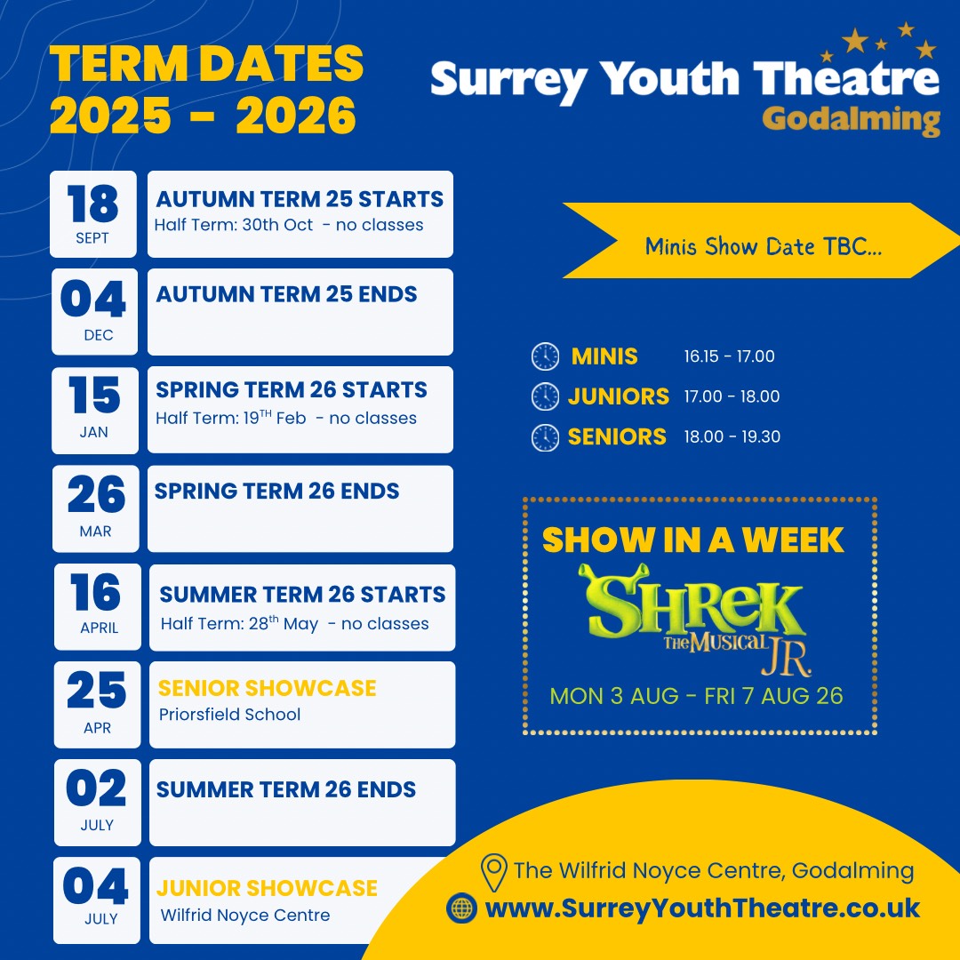 Our weekly sessions run during the week in the centre of Godalming at The Wilfrid Noyce Centre (See class timetable) with performances held at the stunning theatre at Priorsfield School. We are also pleased to offer after school clubs at local primary schools. Our young people meet in groups according to their age and are led by a team of outstanding teachers who are not only experienced in the teaching field but are also talented performers who have trained at accredited drama schools.